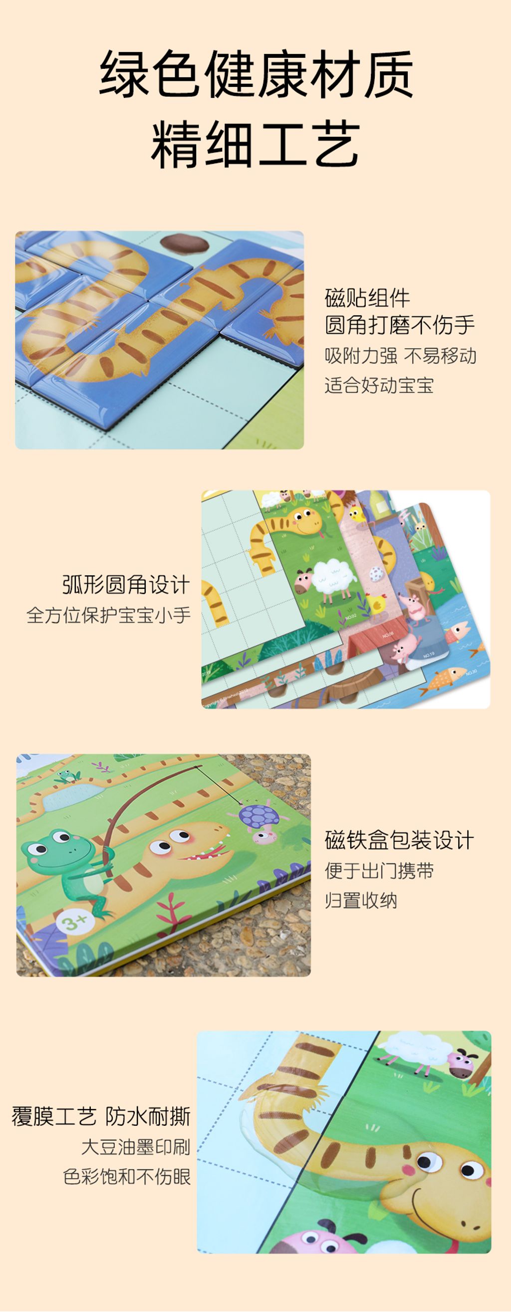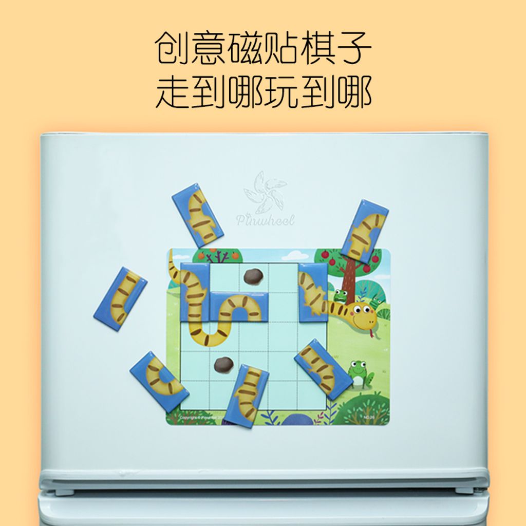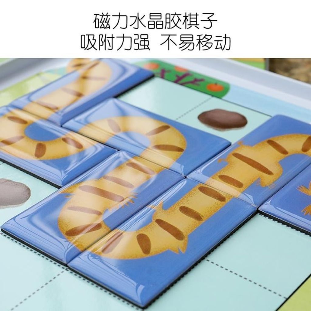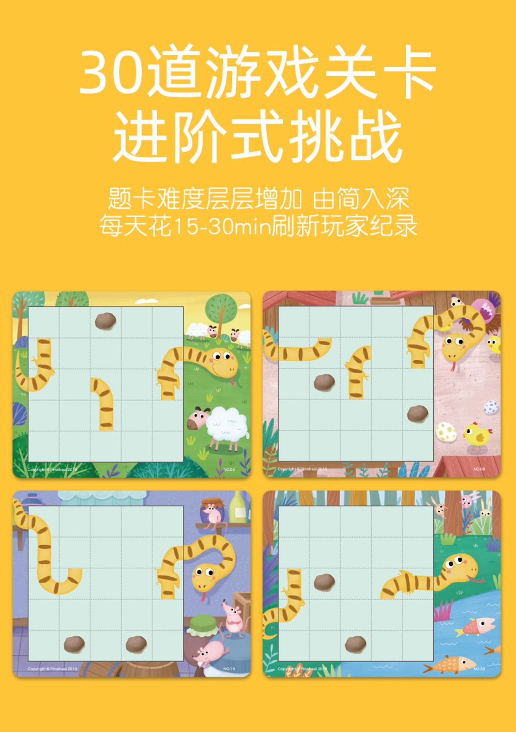 It has 15 game cards and 7 pieces of magnets. The game card gives the fixed position of snake-head and snake tail, and this is the known condition. This can be completed with careful observation. After the placement is done, if all the magnets are placed such that the snake-head and the snake tail can be connected, the answer is correct.