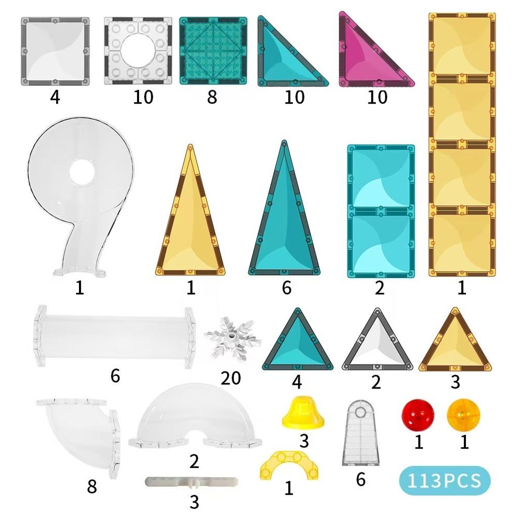 - 【Magnetic Tiles Play Set】A total of 113 pieces to build a christmas tree. The magnetic Tiles can be freely assembled. Children can acquire strong sense of color, geometrical shapes including 3D forms numbers counts, magnetic polarities & architectural design at early age